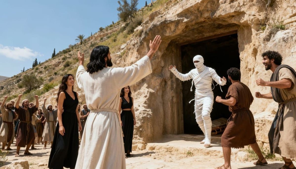 Nói xong bà về gọi Maria em gái bà và nói thầm với em rằng: “Thầy ở ngoài kia, Thầy gọi em”. Nghe vậy, Maria vội vàng đứng dậy và đi đến cùng Chúa. Vì lúc đó Chúa Giêsu chưa vào trong làng, Người còn đang đứng ở nơi Martha đã gặp Người. Những người Do-thái cùng ở trong nhà với Maria và an ủi bà, khi thấy bà vội vã đứng dậy ra đi, họ cũng đi theo bà, tưởng rằng bà đi ra khóc ngoài mộ. Vậy khi Maria đến chỗ Chúa Giêsu đứng, thấy Người, bà liền sấp mình xuống dưới chân Người và nói: “Thưa Thầy, nếu Thầy có mặt đây, thì em con không chết”. Khi thấy bà khóc nức nở và những người Do-thái theo bà cũng khóc, Chúa Giêsu thổn thức và xúc động. Người hỏi: “Ðã an táng Ladarô ở đâu?” Họ thưa: “Thưa Thầy, xin đến mà xem”. Chúa Giêsu rơi lệ. Người Do-thái liền nói: “Kìa, xem Ngài thương ông ấy biết bao!” Nhưng có mấy kẻ trong đám nói: “Ông ấy đã mở mắt người mù từ khi mới sinh mà không làm được cho người này khỏi chết ư?” Chúa Giêsu lại xúc động; Người đi đến mộ. Mộ đó là một hang nhỏ có tảng đá đậy trên. Chúa Giêsu bảo: “Hãy đẩy tảng đá ra”. Martha là chị người chết, thưa: “Thưa Thầy, đã nặng mùi rồi vì đã bốn ngày”. Chúa Giêsu lại nói: “Ta đã chẳng bảo con rằng: Nếu con tin, thì con sẽ xem thấy vinh quang của Thiên Chúa sao?” Thế là người ta cất tảng đá ra. Chúa Giêsu ngước nhìn lên và nói: “Lạy Cha, Con cảm tạ Cha đã nhậm lời Con. Con biết Cha hằng nghe lời Con, nhưng Con nói lên vì những người đứng xung quanh đây, để họ tin rằng Cha đã sai Con”. Nói rồi, Người kêu lớn tiếng: “Ladarô! Hãy ra đây!” Người đã chết đi ra, chân tay còn quấn những mảnh vải, trên mặt quấn khăn liệm. Chúa Giêsu bảo: “Hãy cởi ra cho anh ấy đi”.